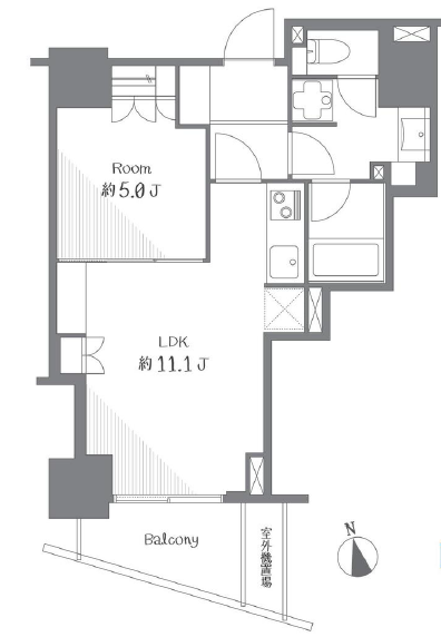 専有面積43.19㎡の1LDKは、約11.1帖のLDKと約5.0帖の洋室を確保したゆとりある間取り。