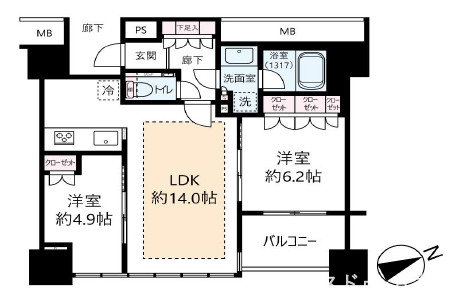 | 専有面積 | 壁芯 57.86㎡ | 所在階 | 23階建/17階部分 |